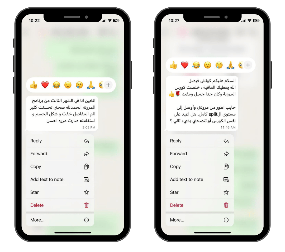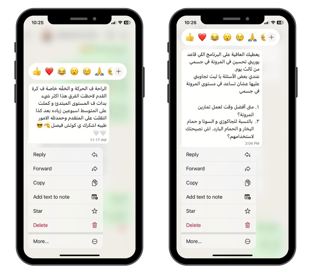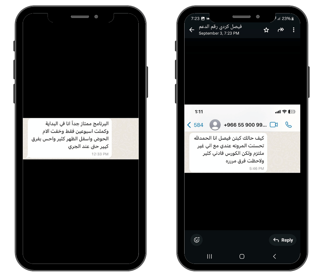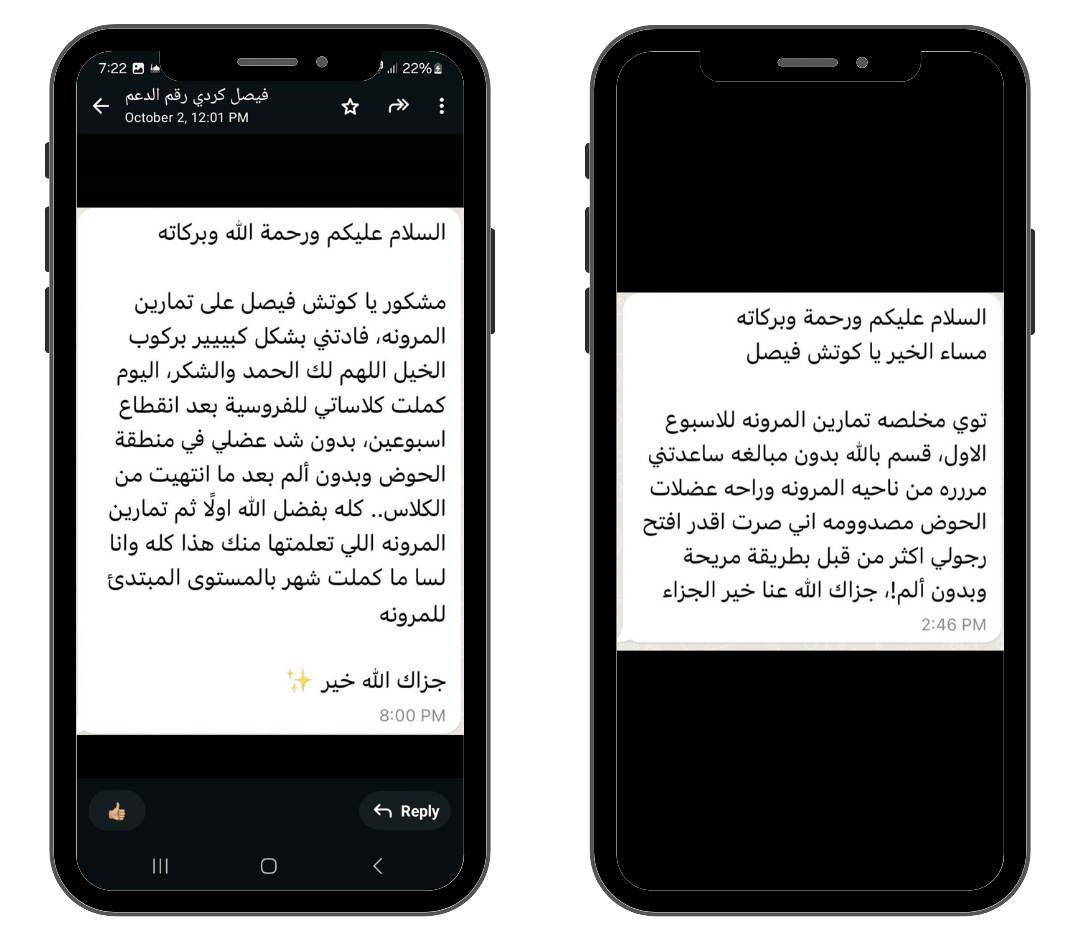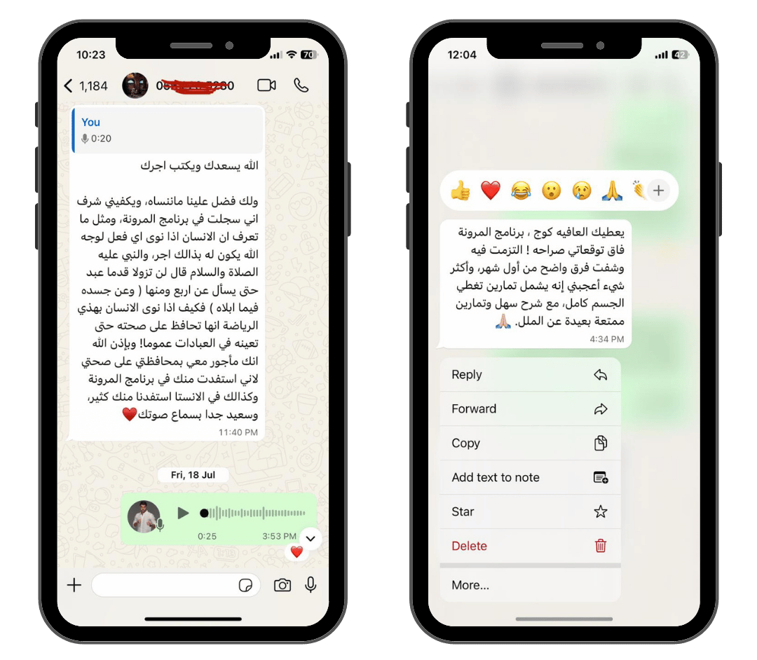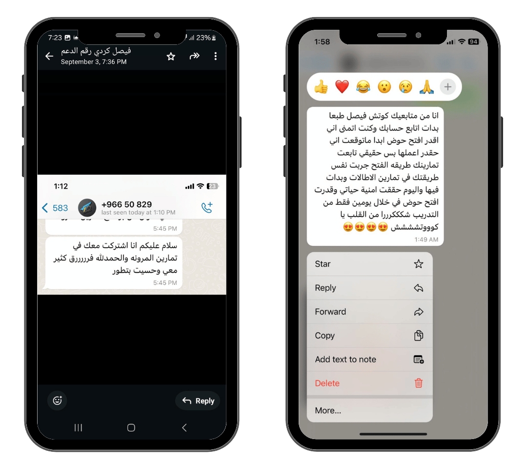 بعد الإشتراك، راح تحصل على رقم واتساب مباشر 💬 للكوتش فيصل، راح يجاوبك على أي سؤال بخصوص التمارين